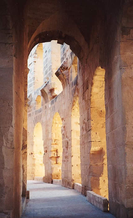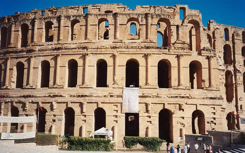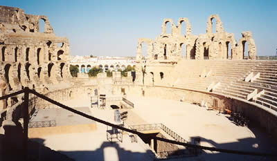 About 120km more to the south (then you are already in the desert), lays El Jem, that once must have been the mighty Roman city of Thysdrus. Nothing is left of the city. Only the Amphitheatre (2nd century AC) is left. The Amphitheatre is the second largest Amphitheatre ever built by the Romans. Only the Colosseum is larger. The outside of the Amphitheatre is very well-preserved on the one side; it has collapsed on the other side. The outside exists out of three levels of arches. The interior has completely disappeared on one side, on the other side some seats are left.