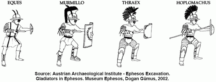 - This gladiatorial category is known since the late Republic and fought – like the eques – always against his own type. In the 1st century BCE and 1st century CE he wore a helmet which resembled a legionary helmet. In 2nd and 3rd centuries CE he had a helmet without a crest and a deep neck-guard with a visor. He had a scutum, a lunar- or bib-shaped pectorale (breast plate) and a gladius. Further protection were an ocrea on the left leg and a manica on the right arm.